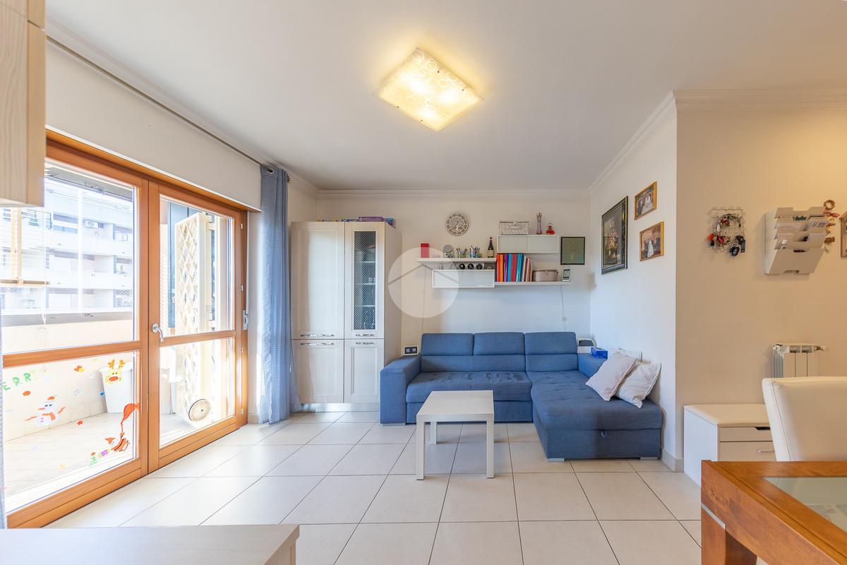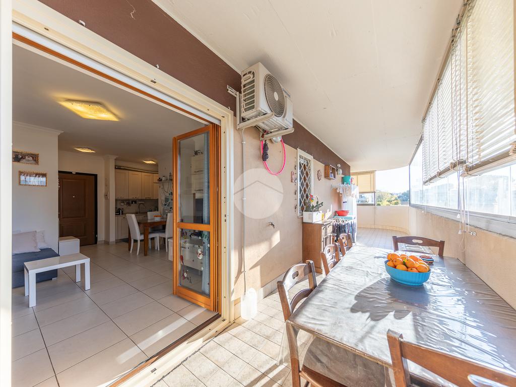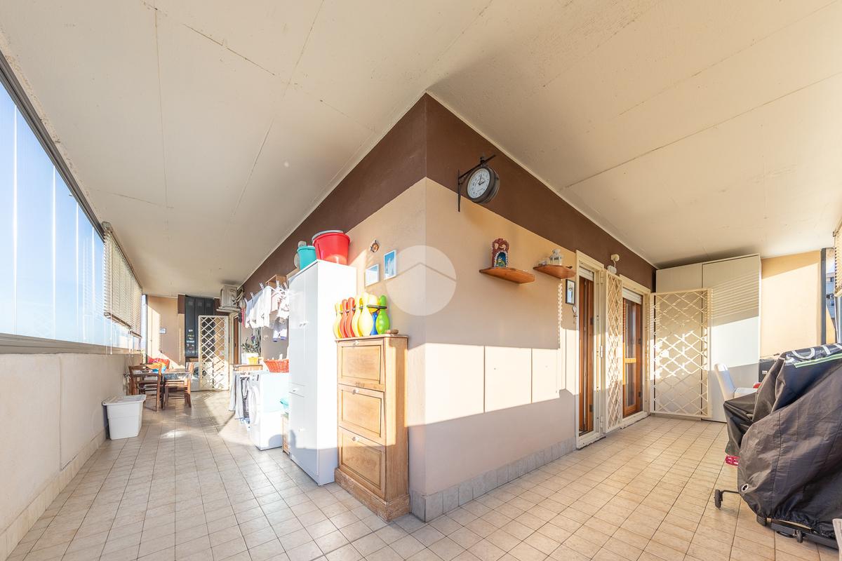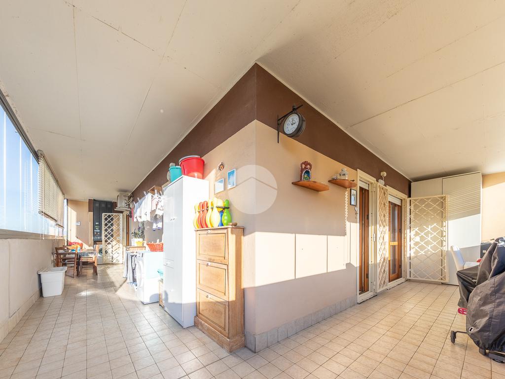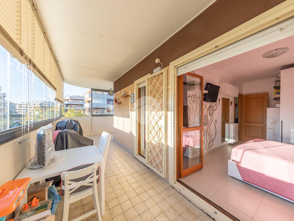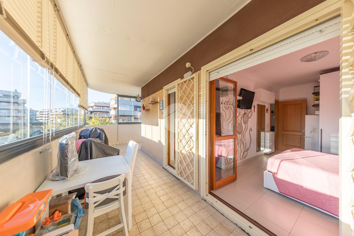 Uno dei punti di forza dell’appartamento è senza dubbio il grande terrazzo angolare, uno spazio esterno davvero vivibile grazie alla sua generosa metratura. Le ampie vetrate permettono di utilizzarlo comodamente anche durante i mesi invernali, trasformandolo in una piacevole estensione della zona giorno.
